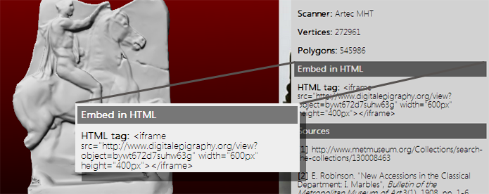 You can easily embed the 3D objects of our Digital Epigraphy and Archaeology database into your own web-site, blog, or personal database. Each virtual exhibit has an HTML tag that can be easily found in the archaeological record of the exhibit (see image below).