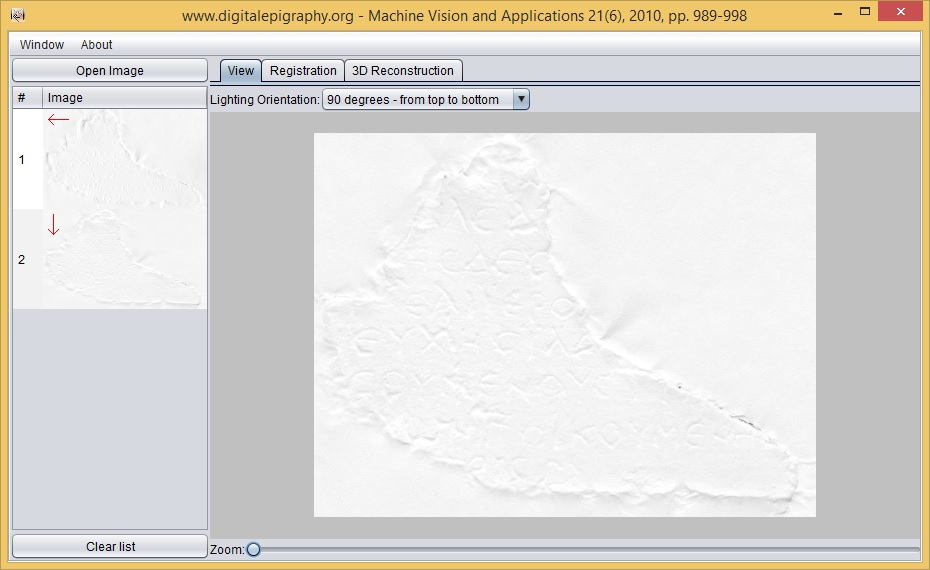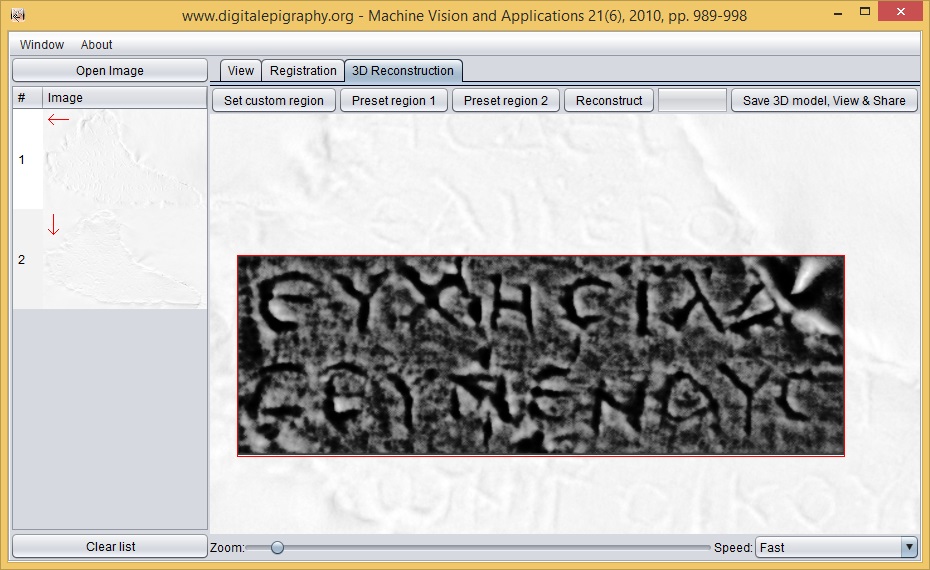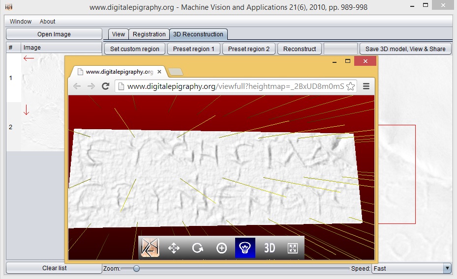 One of the features of the Digital Epigraphy Toolbox is to provide archaeologists and epigraphists with a cost-effective and efficient method for 3D digitization of inscriptions based on squeezes (impressions of inscriptions on a paper). This method uses a regular flatbed office scanner to analyze a pair of scanned images of squeezes and reconstruct in 3D the original inscription. More details regarding this algorithm can be found in our publication 1. Click on the 'Launch Application' button to start the 3D reconstruction algorithm.