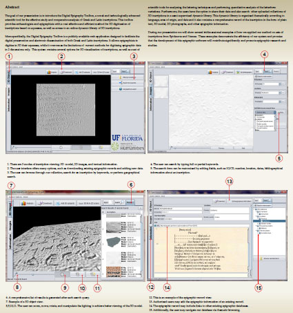 Features: On-line database of 3D inscriptions, 3D rotation, change lighting orientation, zoom in/out, thematic browsing, keyword search, connection with other existing on-line libraries, dynamic and open editing of the epigraphic records by the research community, and many other features.