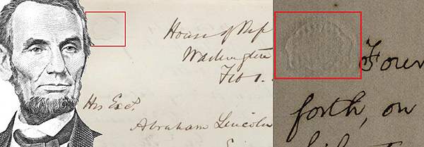 A similar embossment can also be found on a letter from T. D. Eliot to Abraham Lincoln dated on February 1, 1864, currently located in the manuscript division of the Library of Congress.