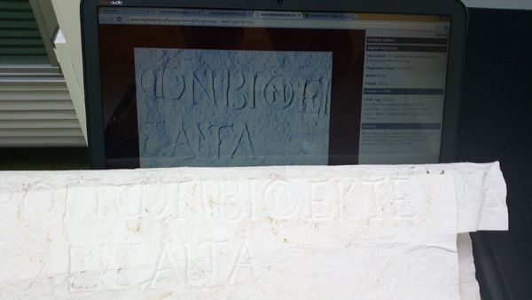 During last summer, the team performed a series of pilot 3D digitization experiments at the University of Lyon in order to establish an efficient process that can be followed in such a large scale digitization project. In this pilot study selected paper casts of inscriptions were digitized using the shape-from-shading framework3 of the Digital Epigraphy Toolbox.
