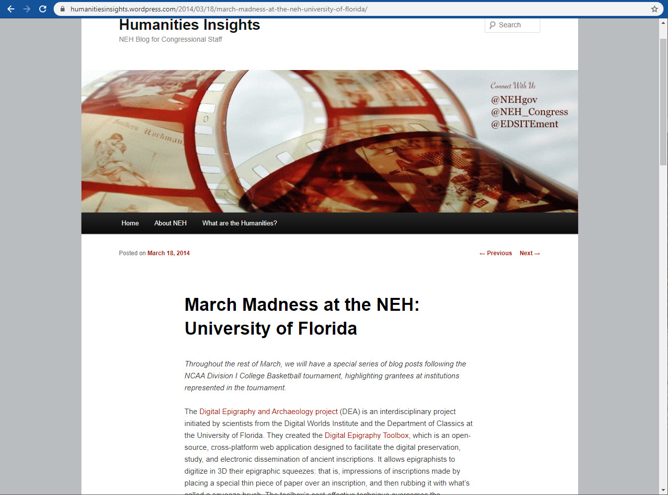 The full article can be found here: https://humanitiesinsights.wordpress.com/2014/03/18/march-madness-at-the-neh-university-of-florida/