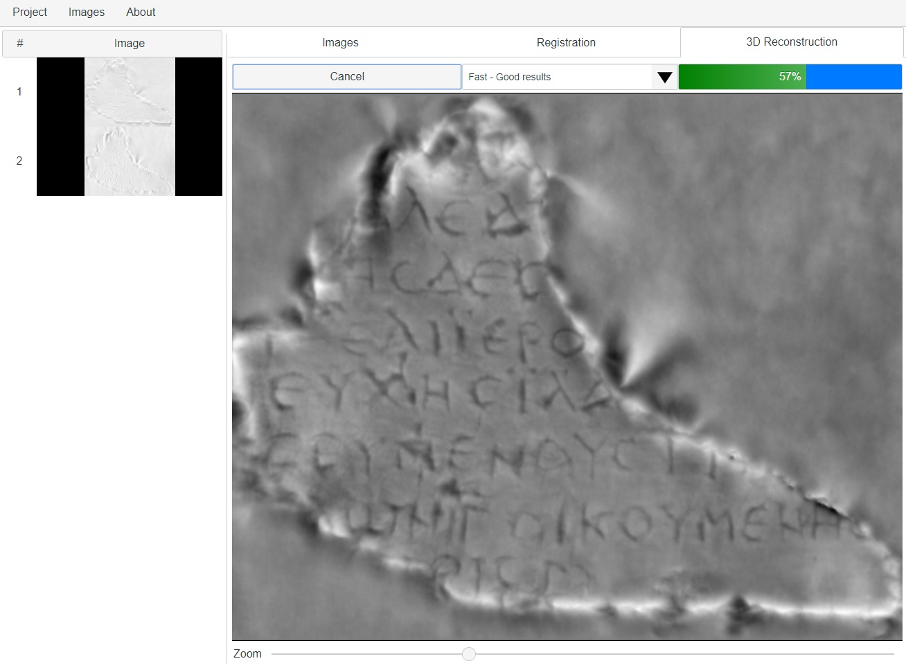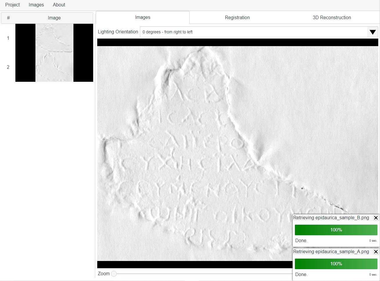 The new on-line tool utilizes cloud technology to store, process, and disseminate the results of the 3D reconstruction algorithm. It allows the users to upload pictures of a flat inscribed object (such as epigraphic squeeze, paper embossment, seal, inscriptions, casts of coins, and others), taken from the same perspective using 2 or 4 different lighting conditions.