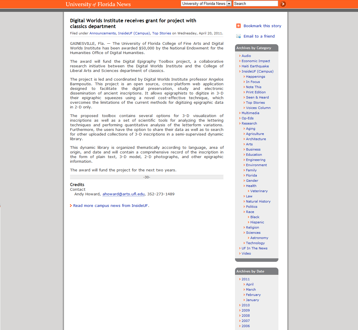 The University of Florida makes a public announcement about the recently funded Digital Epigraphy Toolbox project. The announcement was featured in the main web-site of the University of Florida and provided the details of the award from the National Endowment for the Humanities. The article titled “Digital Worlds Institute receives grant for project with classics department” was authored by Andy Howard from the Deans Office of the College of Fine Arts.